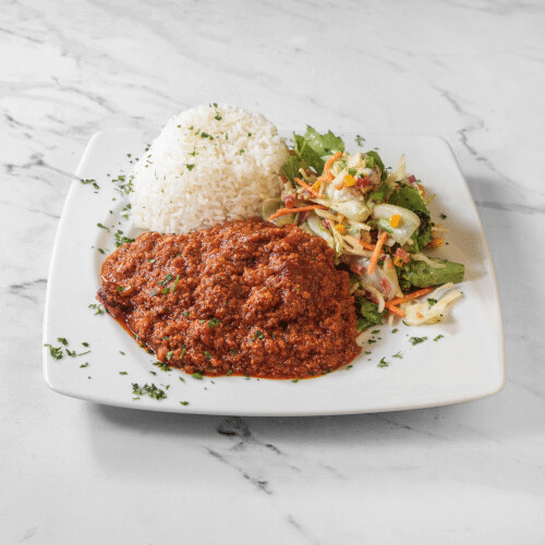 Aubergine und Schweinefleisch in Tomatensauce, dazu Salat